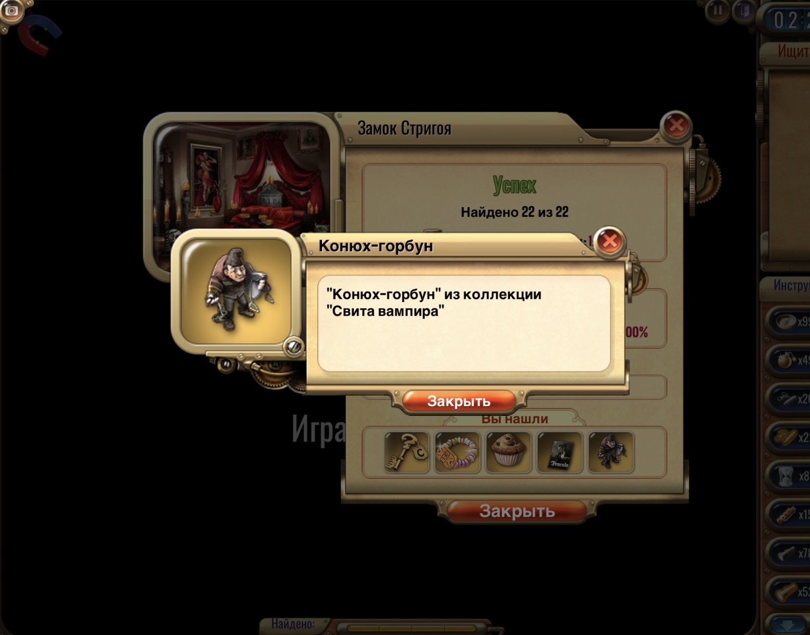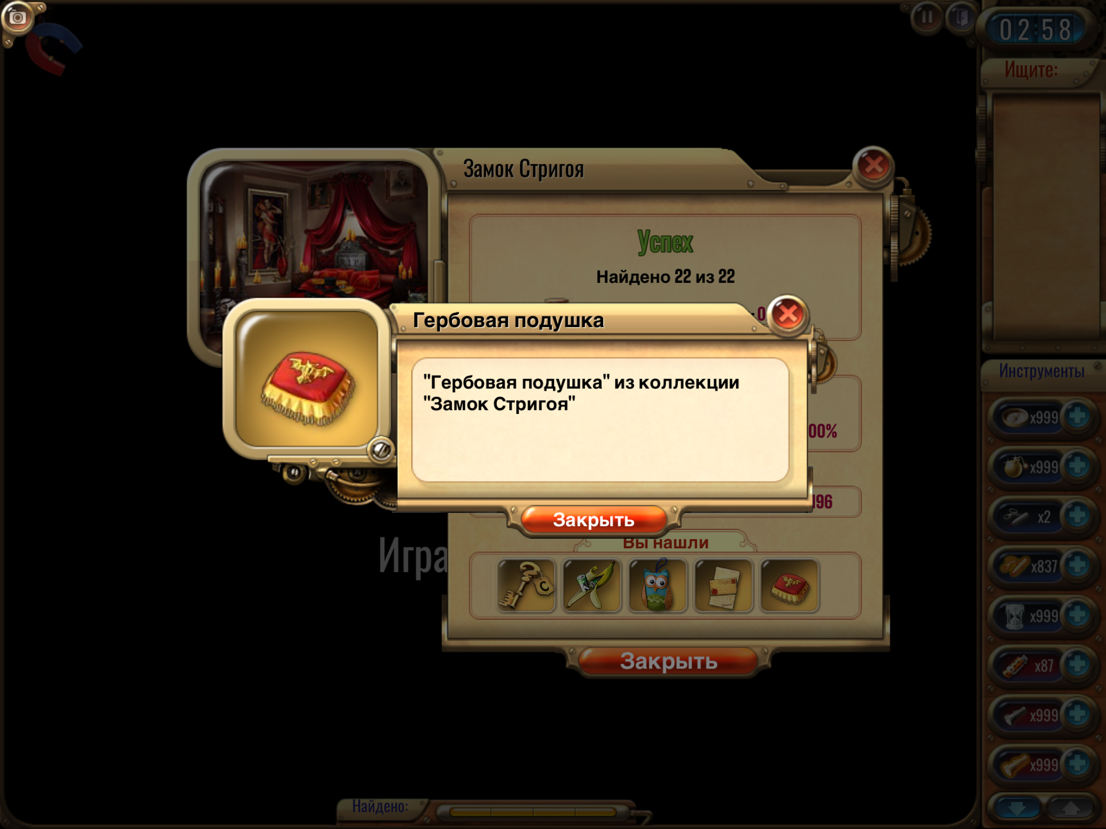 ✔ из списка, выпадающего после прохождения, сделать скрин подходящего под задание предмета <br>