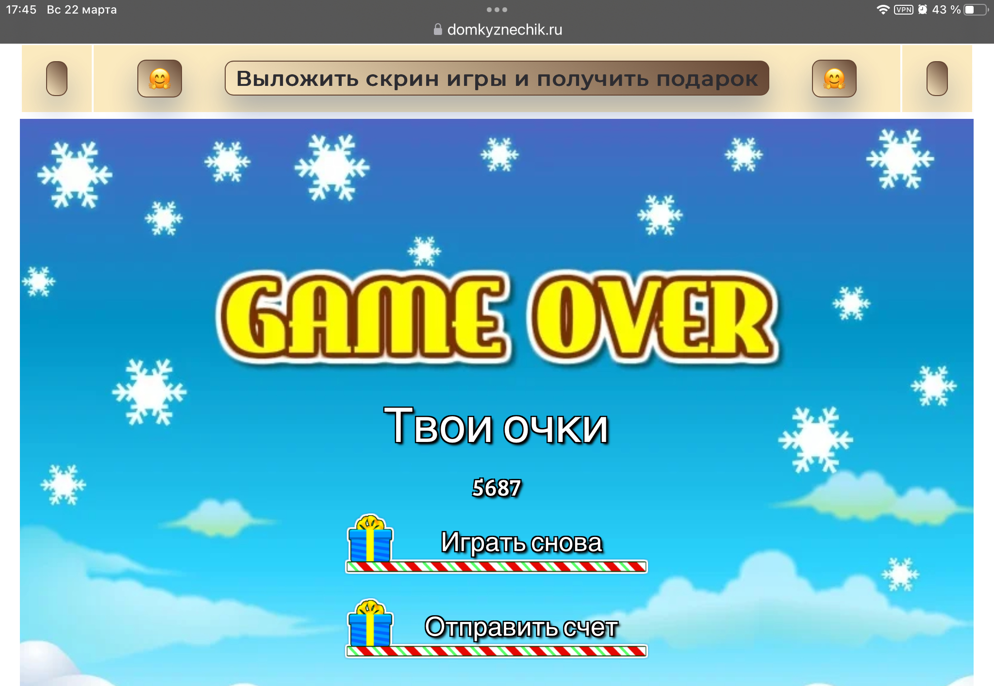 <tr><td height="35" style="background:url('') #4a150e;padding-top:7px;color:#FAE8C0;" align="center"><b>Сыграй в игру,выложи скрин и получи приз.В сутки 5 🎁 <br />