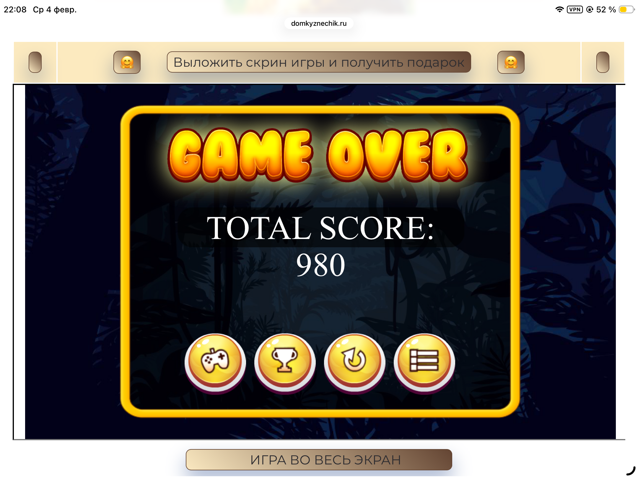 <tr><td height="35" style="background:url('') #4a150e;padding-top:7px;color:#FAE8C0;" align="center"><b>Сыграй в игру,выложи скрин и получи приз.В сутки 5 🎁 <br />