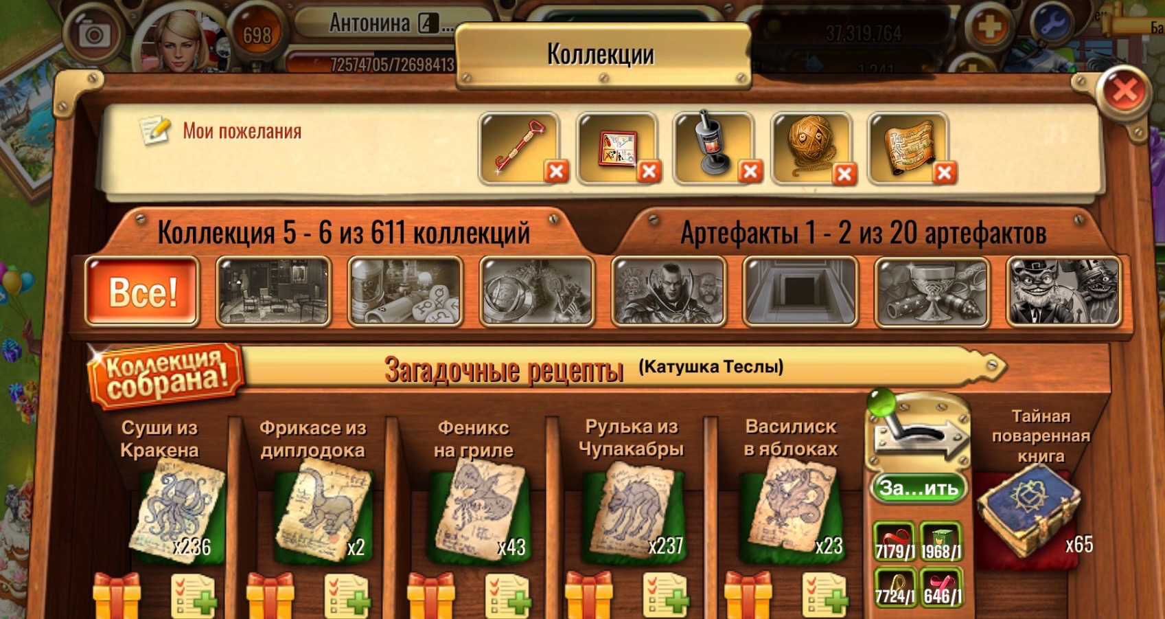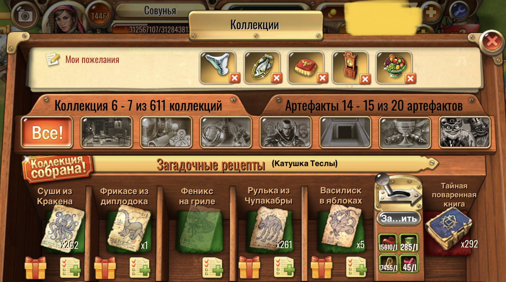 <div class="content"> По окончанию соревнования пишем, сколько рецептов собрали (если зарядили коллекцию прибавьте 5*на количество заряженных коллекций) + скрин, где видно количество предметов коллекции №6 Загадочные рецепты, ник и уровень в игре!